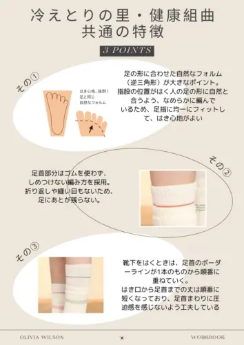 ※お断り:この「健康組曲」はあくまで「冷えとり健康法」の推奨する重ね履きに適した靴下であって、「冷えとり健康法」の 効能そのものの判断は、各自の責任でおこなってください。