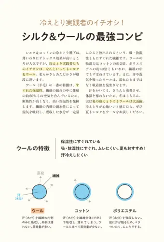 外側の羊毛は絹から放出された湿気を繊維の内側のみに吸収し、素早く発散させます。