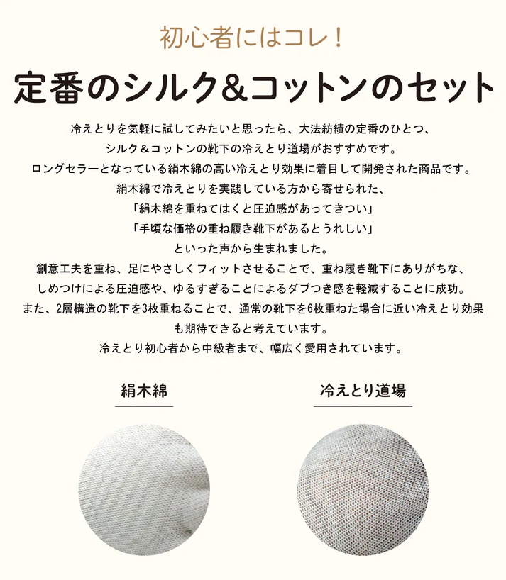 絹と綿の特殊な「二重構造」が湿気の逆流を防いで、絹をいつもサラサラに保ち、ムレずに爽やかな履き心地。