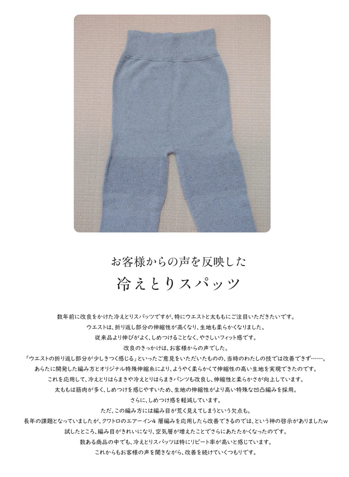 腿のとこは凹凸編みで、男子も共用ってよく研究されてるし、思いやりある商品やね(自然食品販売店経営 女性)