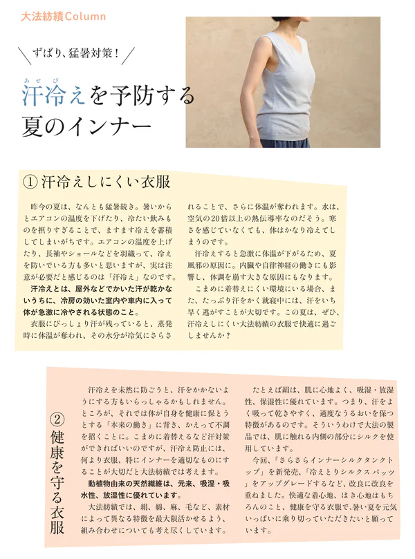 昨年春新発売した、シルク100% のインナータンクトップは、いつでもさらさらな肌ざわりで大変ご好評をいただいております。
